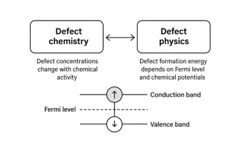 This tutorial-article explores two ways of looking at defects in solids. One perspective, called defect chemistry, treats them with chemical reaction rules: concentrations of defects change depending on the chemical environment, and everything must balance in terms of charge and atoms. The other perspective, defect physics, uses thermodynamics and quantum mechanics to calculate how much energy is needed to form a defect. This energy depends on both the position of the Fermi level and the chemical environment.